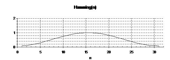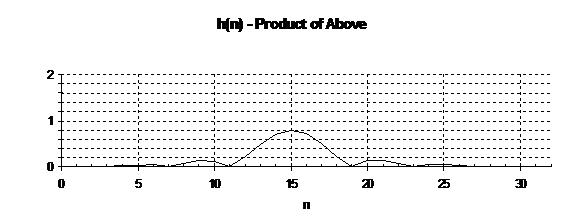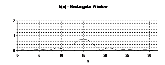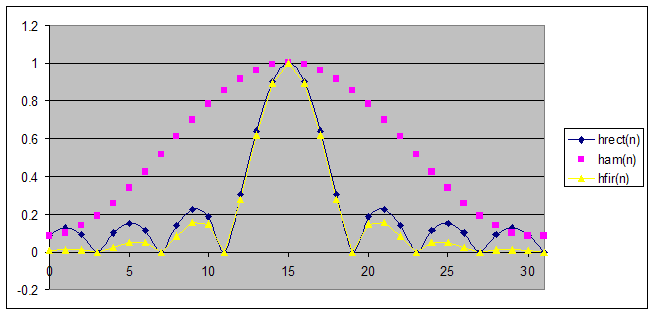 The pulse response is the product of sin(x)/x (the Inverse Fourier Transform of the ideal filter shifted to center at n=16) and the Hamming raised cosine window function.