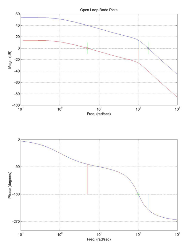 --- For the blue Bode plot, the 0 dB crossover occurs at a frequency of around 181 (rad/sec) and is shown with a blue 'o'.