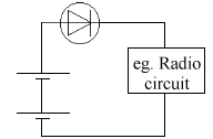 The Light Emitting Diode (LED) is made of a different material. Its forward voltage drop is 2v, & the maximum current is about 50 mA. It requires a series resistance to limit the current. The LED is generally used as an indicator, as it doesn't give off enough light to be used as a light source.