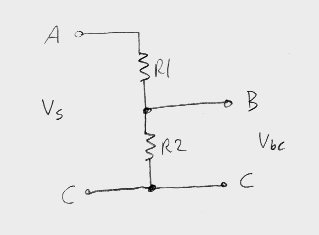 Vbc= i(R2) Vs = i(R1+R2) i=Vs/(R1+R2) Vbc=(Vs/(R1+R2) )R2 Vbc=(Vs)R2/(R1+R2)In other words, the voltage out is equal to the voltage in multiplied by the proportion of the lower resistance over the sum of the resistances. The proportion R2/(R1+R2) is easy to use to derive any desired output voltage (less than Vs, of course).