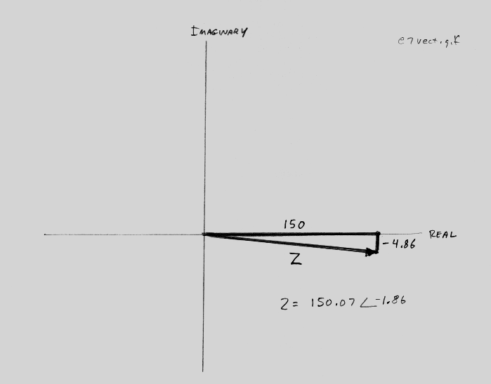 In our example, the magnitude is 150.07 and the angle is -1.86. If we write Z in polar form, it is then 150.07<-1.86.
